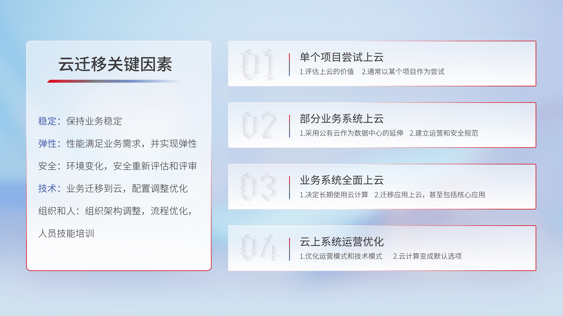 结合实际业务,,,,从规划设计、、、、云平台选型、、云原生改造、、、数据迁移、、集成交付,,,迁移全过程为客户识别最佳上云路径,,,,做好风险识别管理,,,,设计网络架构、、身份权限、、、安全审计合规、、操作审计、、、、日志审计、、监控告警策略、、多站点容灾设计等,,,,对云上基础设施进行整体规划,,,,提升IT治理水平,,,以满足弹性、、、、高可用、、高性能的需求。。。