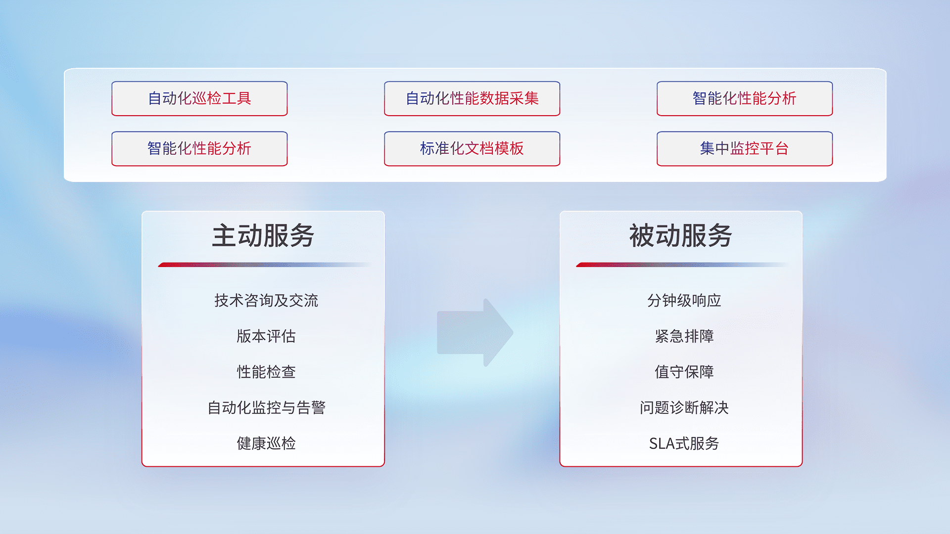 智能化工具和标准化文档,,,保障服务质量,,,,提供主动服务(包含技术咨询、、版本评估、、、、性能检查、、、、自动化监控与告警、、、健康巡检)和被动服务包含(分钟级响应、、、、紧急排障、、、值守保障、、、问题诊断解决、、、、SLA服务)。。。